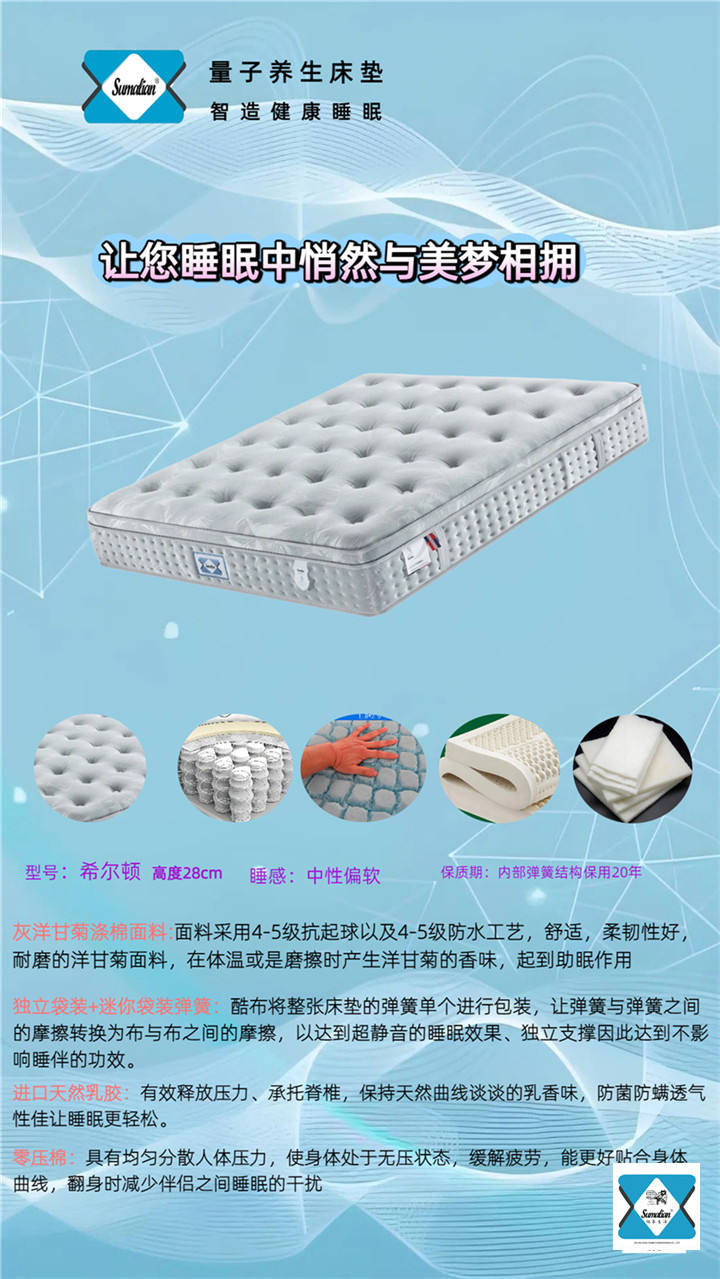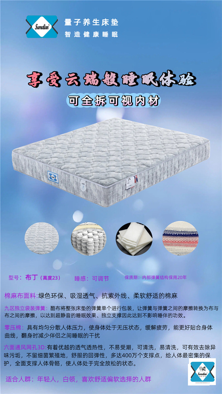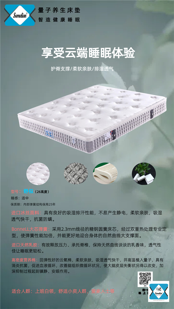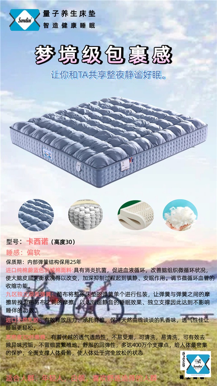 美国Sumalian床垫和枕头作为睡眠技术领域最大突破的先驱已有30多年的历史,一张床垫最重要的作用是给身体提供她想要的支持并不引起任何压力点,外加正确的枕头给颈部以正确的支持。美国Sumalian床垫和枕头的功能正在于此。他们通过让脊椎和关节以其自然的生理状态休息而提供身体和颈部完全的支持。你的体重完全平均分散到床垫和枕头上,完全释放压力,享受一种前所未有的无重感。